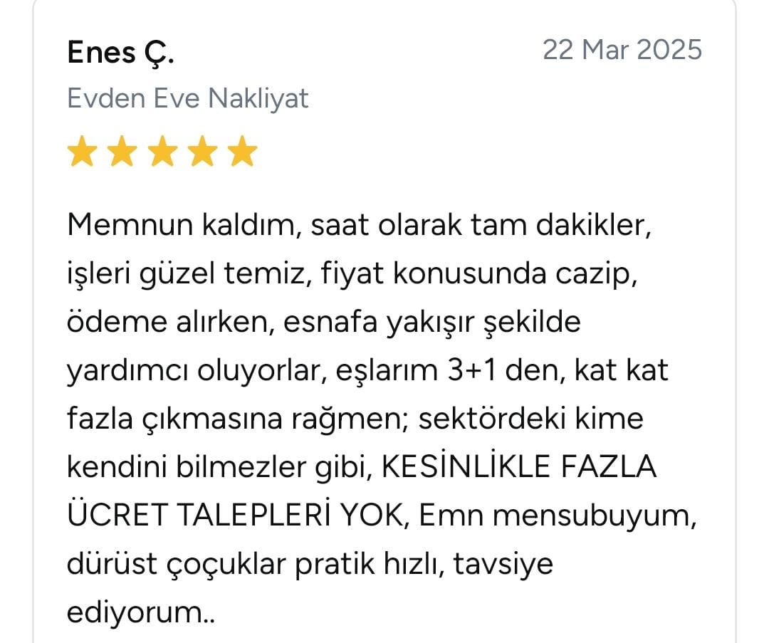 Müşteri memnuniyetini her zaman ön planda tutan firmamız, zamanında teslimat, şeffaf fiyatlandırma ve kaliteli hizmet ilkeleriyle çalışmaktadır. Taşınmanın stresli bir süreç olduğunun farkındayız; bu nedenle her aşamada planlı, dikkatli ve çözüm odaklı bir yaklaşım benimsiyoruz.